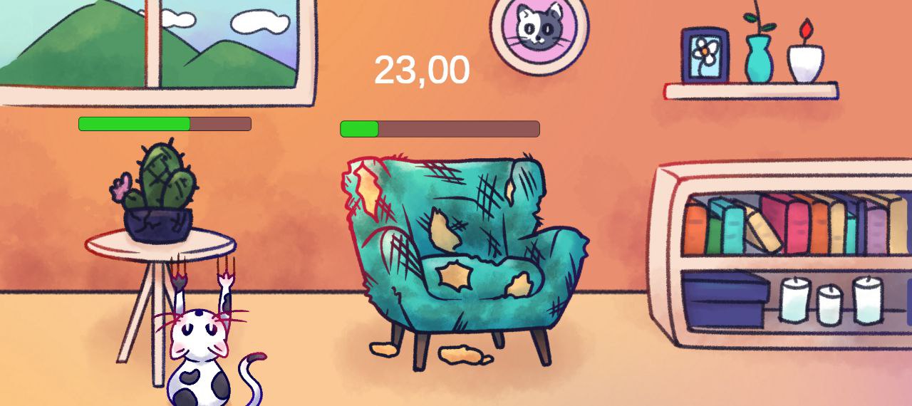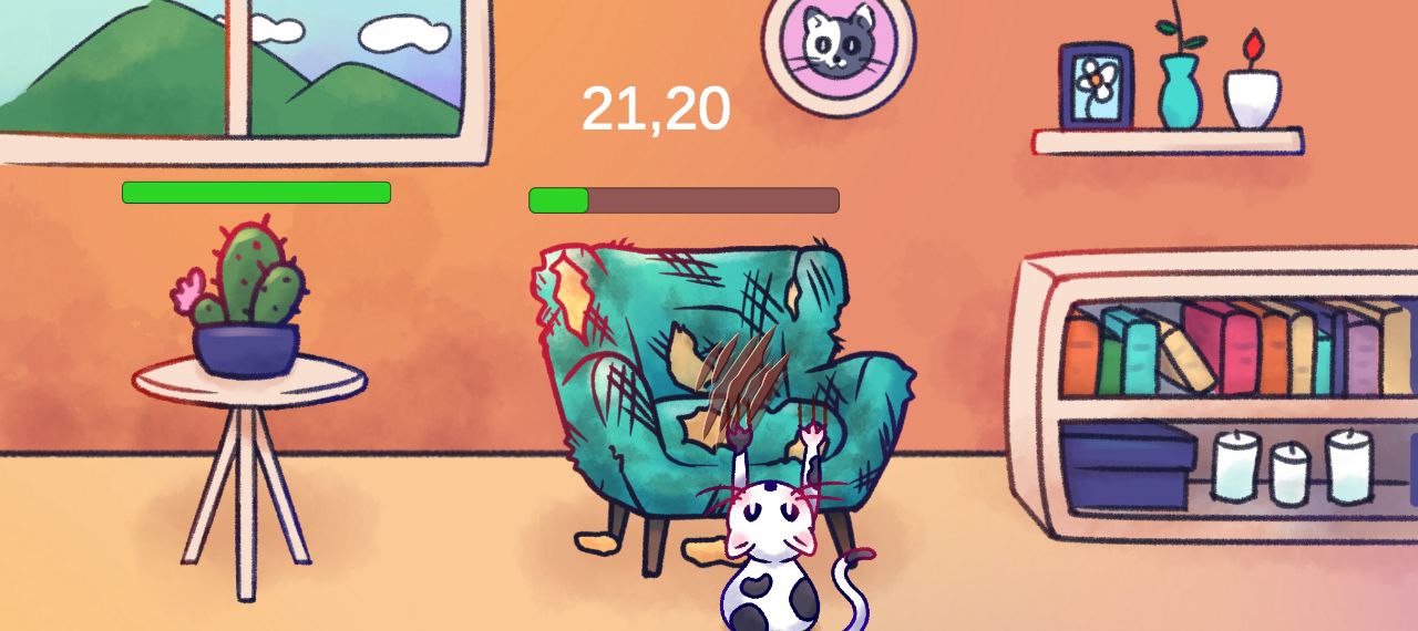ClickCatScratch is a small mobile prototype where you play as a mischievous cat whose only mission in life is to destroy every piece of furniture in the house. Move your character by tilting your phone thanks to gyroscope input, get close to a target, and tap the screen to scratch it until it breaks to pieces.